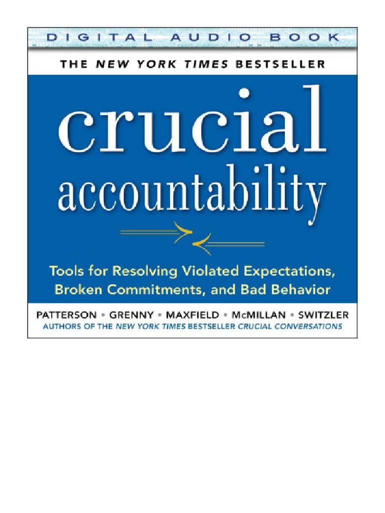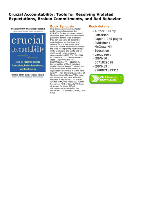Crucial accountability resolving expectations commitments. 9780071829311 from amazons book store. Subtitled tools for resolving violated expectations broken commitments and bad behavior this book is the updated version of crucial conversations the authors are the leaders of vitalsmarts an innovator in best practices training products and services. Kindle edition by kerry patterson author ronswitzler a grenny josephmcmillan author format. Tools for resolving violated expectations broken commitments and bad behavior second edition paperback 2 by patterson kerry grenny joseph mcmillan ron switzler al maxfield david isbn.