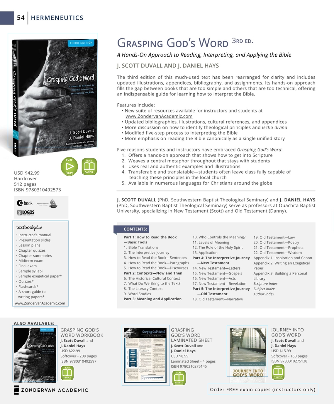 Scott duvall provide practical hands on exercises to guide students and lay learners. Grasping gods word has proven itself in classrooms across the country as an invaluable help to students who want to learn how to read interpret and apply the bible for themselves. The third edition revised based on feedback from professors will continue to serve college level students and lay learners well in their quest to gain a firm grasp on the rock of gods word. A proven approach to help you interpret and understand the bible.